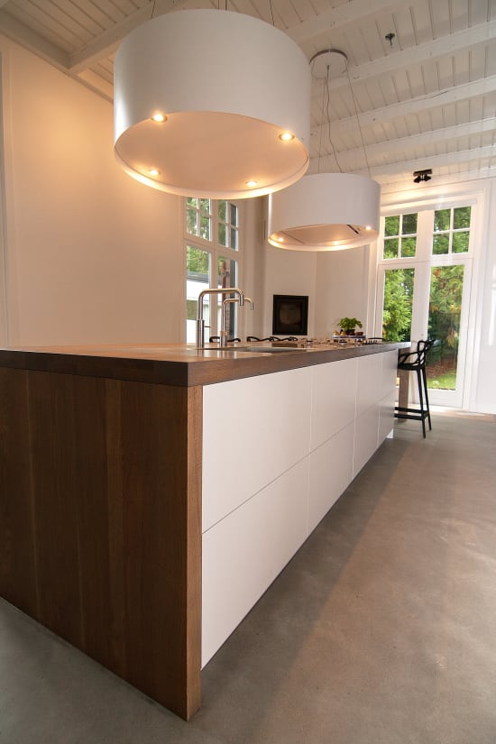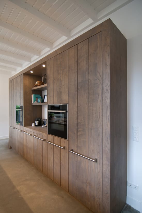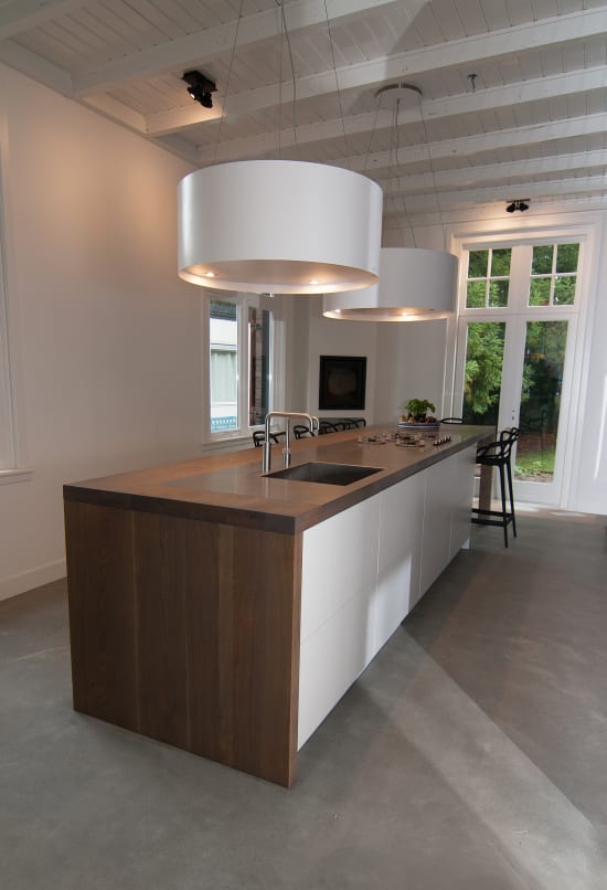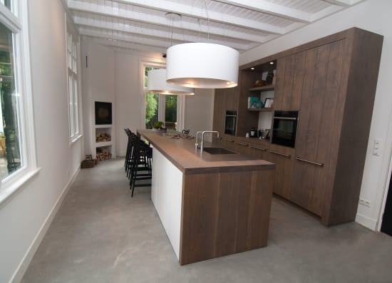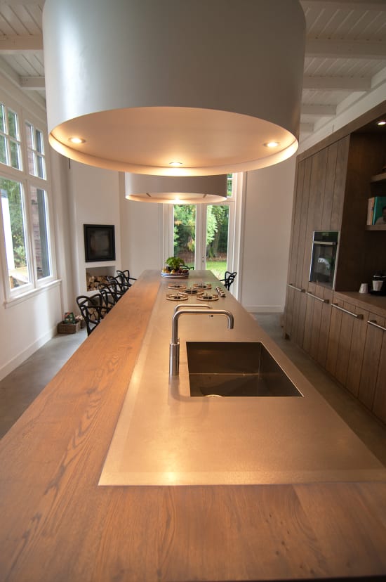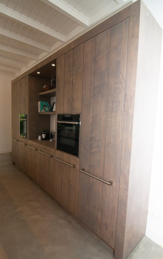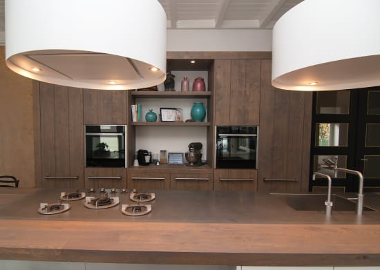 Het prachtige oude huis van Hans en Wendy ligt aan een statige laan in het Gooi, grenzend aan een heideveld. Onze uitdaging was een keuken te realiseren die daar recht aan doet. Door een groot eiland centraal in de ruimte te zetten, dat een rol vervult als kook-, spoel- en werkplek, maar ook als combinatie van bar en tafel. In het lange houten blad is een plaat RVS verwerkt waarin naadloos de spoelbak en kookplaat zijn geïntegreerd. Een grote kastenwand biedt ruimte aan de ovens en de noodzakelijk opbergplek.