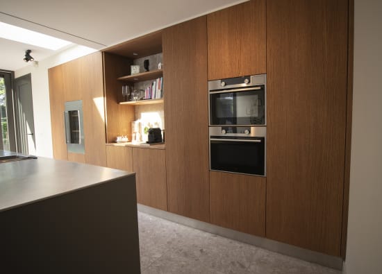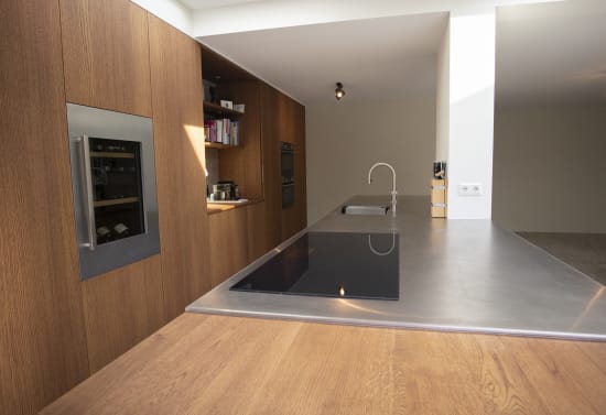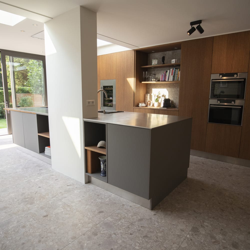 De keuken van Eelco en Alexandra is een unieke ruimte waarbij we gebruik hebben gemaakt van een combinatie van materialen. De bar, kastenwand en planken in de nissen zijn gemaakt van gebeitst eikenhout voor een warme uitstraling. Het houten barblad, waarin ook de greepsparingen zijn gefreest, loopt onder het RVS-werkblad vandaan om ruimte te bieden aan twee barkrukken. Een keuken die functioneel en stijlvol tegelijk is.