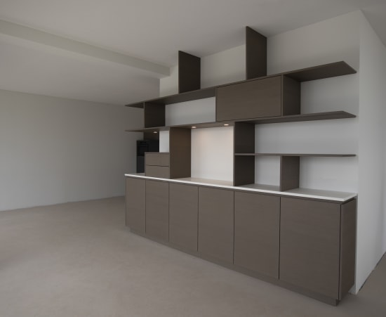 De wens van Wessel en Wietske voor hun nieuwe appartement was de keuken door te laten lopen in de woonkamer, om deze twee ruimtes bij elkaar te betrekken. De keuken loopt als wandkast de hoek om naar de kamer zodat deze één geheel vormt, zonder dat beide delen hun eigen identiteit verliezen. We zijn de uitdaging aangegaan om de spots, bedrading en wandbevestiging onzichtbaar weg te werken in panelen van slechts 18 millimeter dik en het werkblad volledig naadloos en uit één stuk door te laten lopen - wat resulteert in een strak (maar ook functioneel) ontwerp.