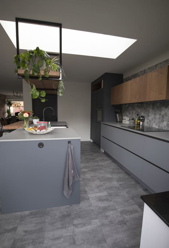 Voor Marco en Megan hebben we een keuken gecreëerd (de tweede al weer!) met een speelse en asymetrische opstelling. De keukenwand is betegeld voordat de muur is gestuct, wat zorgt voor een naadloze overgang tussen het stucwerk en de handgeschilderde tegels die qua kleur aansluiten bij het werkblad en de onderkasten. Er is gewerkt met verschillende materialen, kastmaten, kastkleuren en werkbladkleuren in een volledig asymetrische keuken. Daarnaast hebben we ook een tv meubel ontworpen waarbij de tv volledig wegvalt in de geplaatste voorzetwand.
